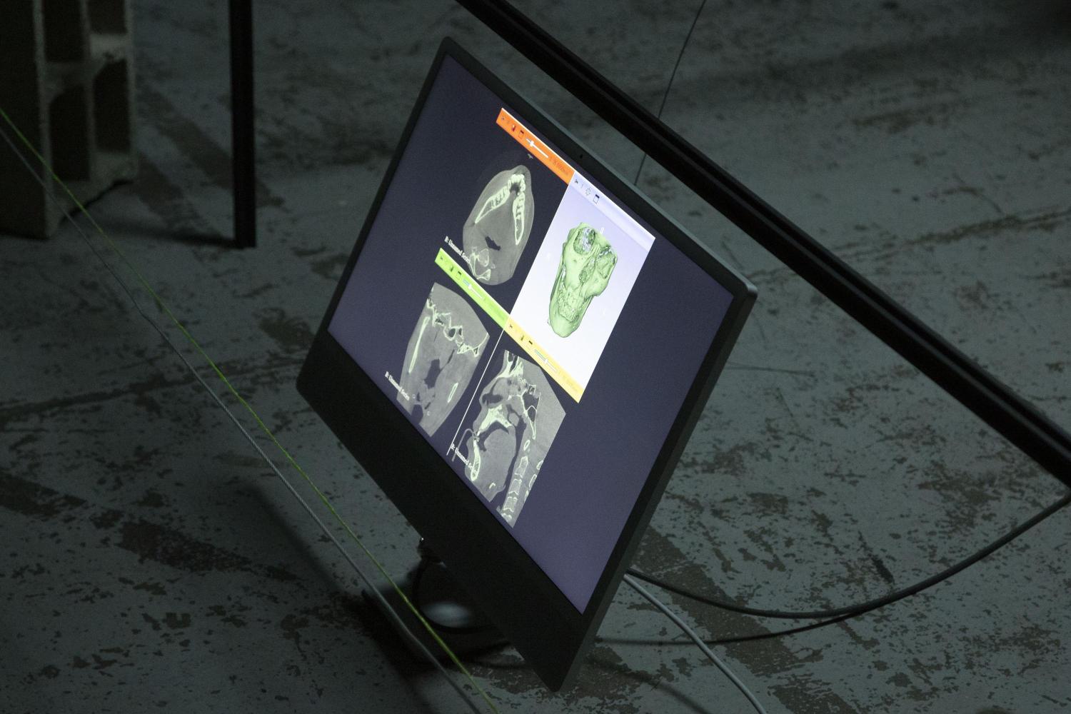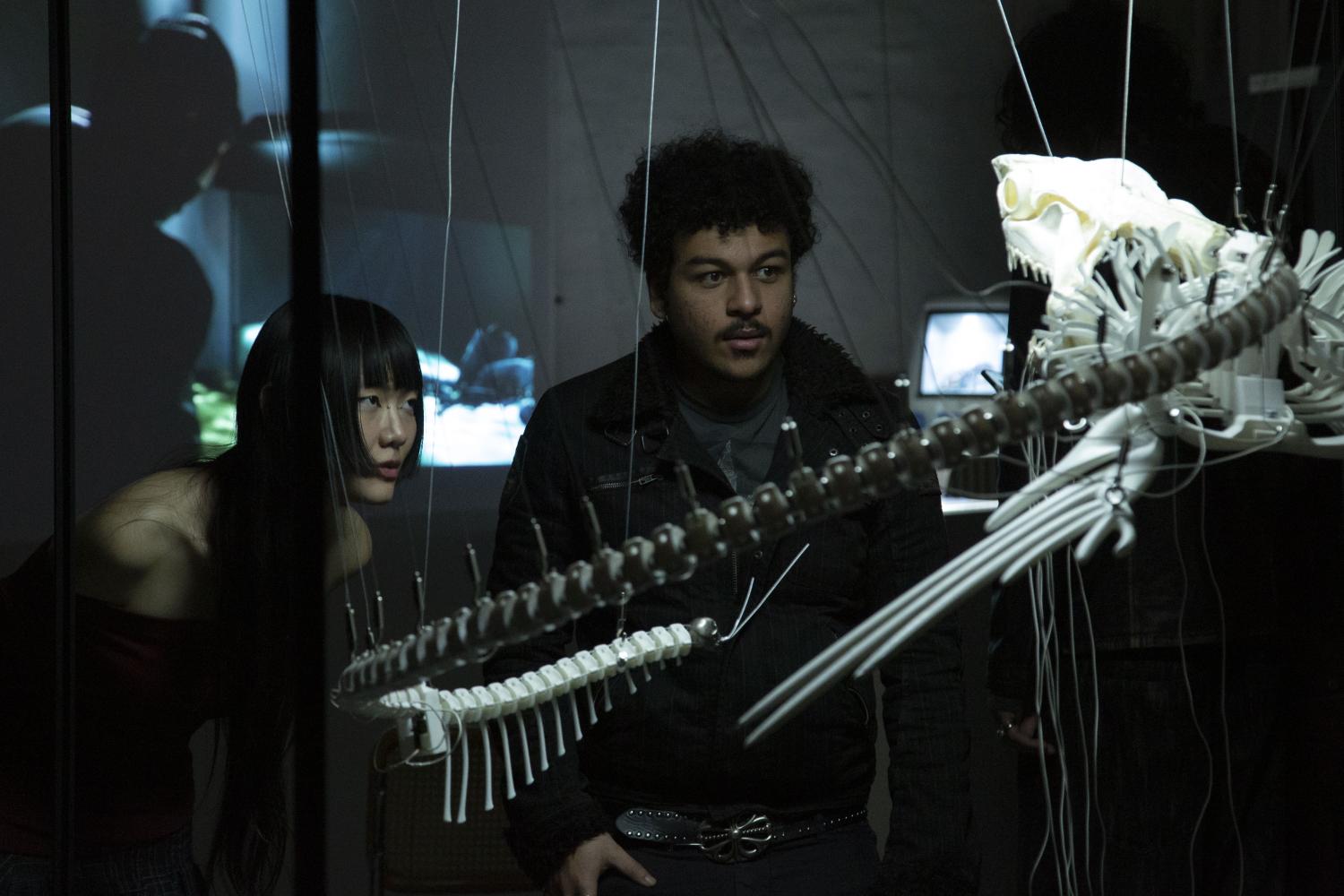 Avec Nager, Jaemin Kim présente une installation cinétique composée d’un squelette de requin motorisé. Ce dispositif met en mouvement une structure figée, évoquant le requin mako, dont la survie dépend du mouvement constant. L’œuvre interroge la contrainte comme moteur, et la manière dont le mouvement peut devenir une condition d’existence.